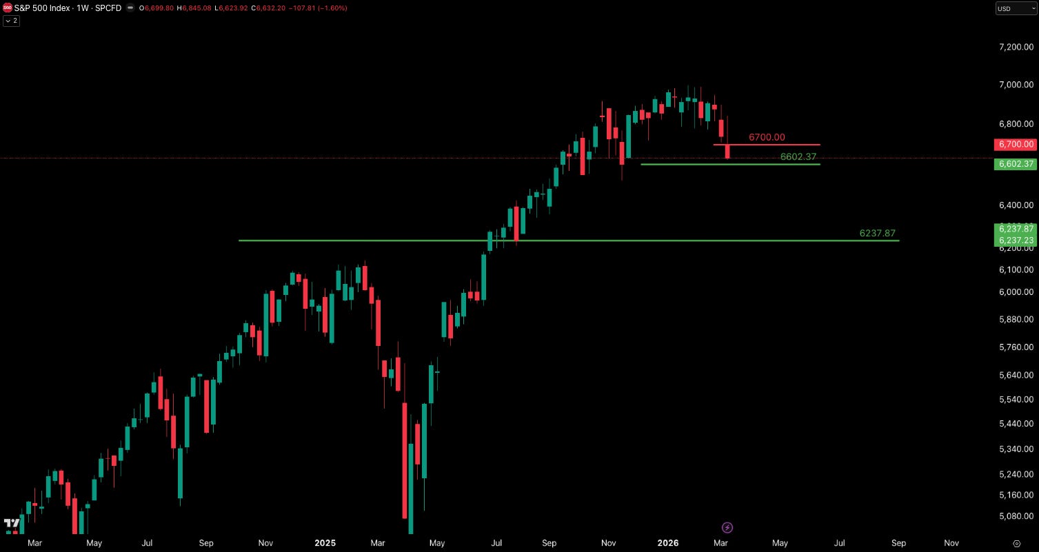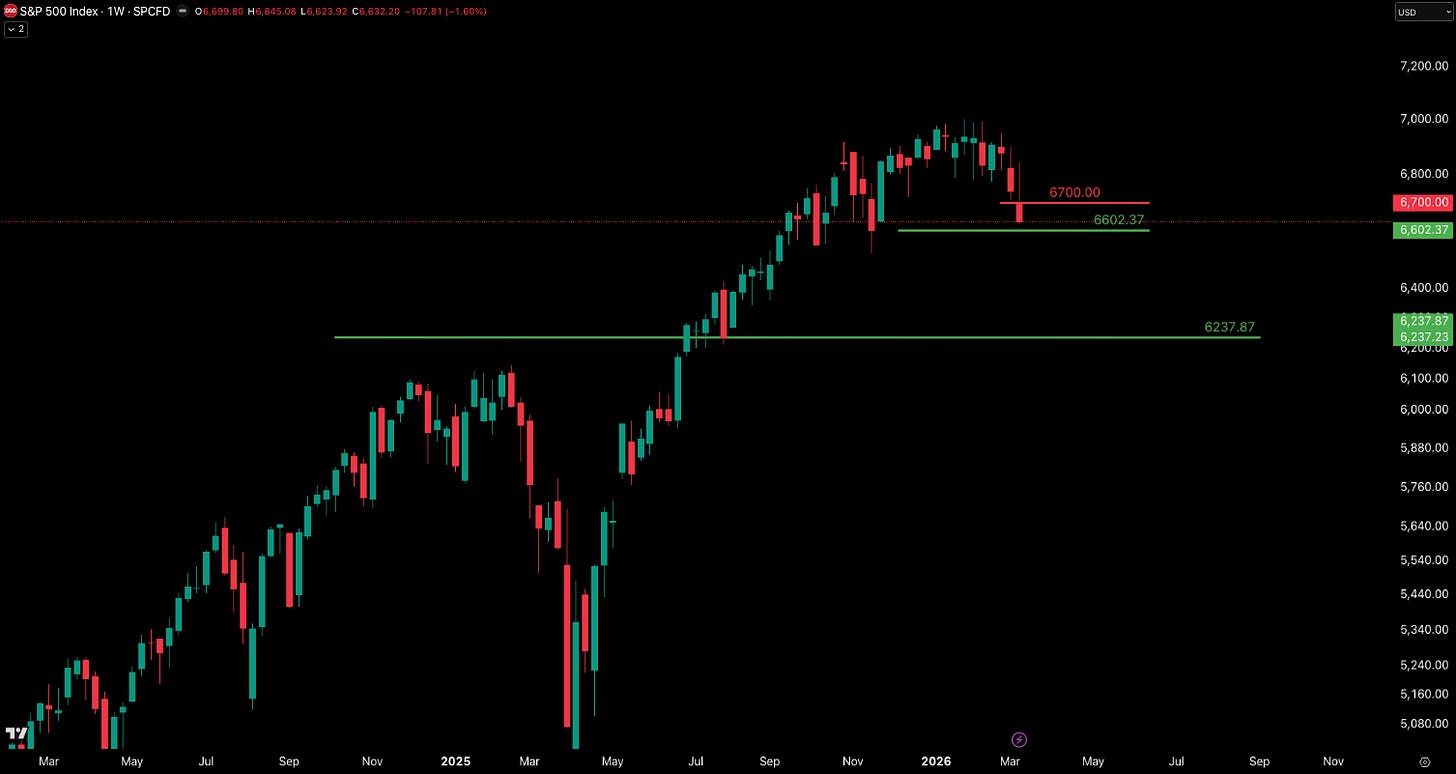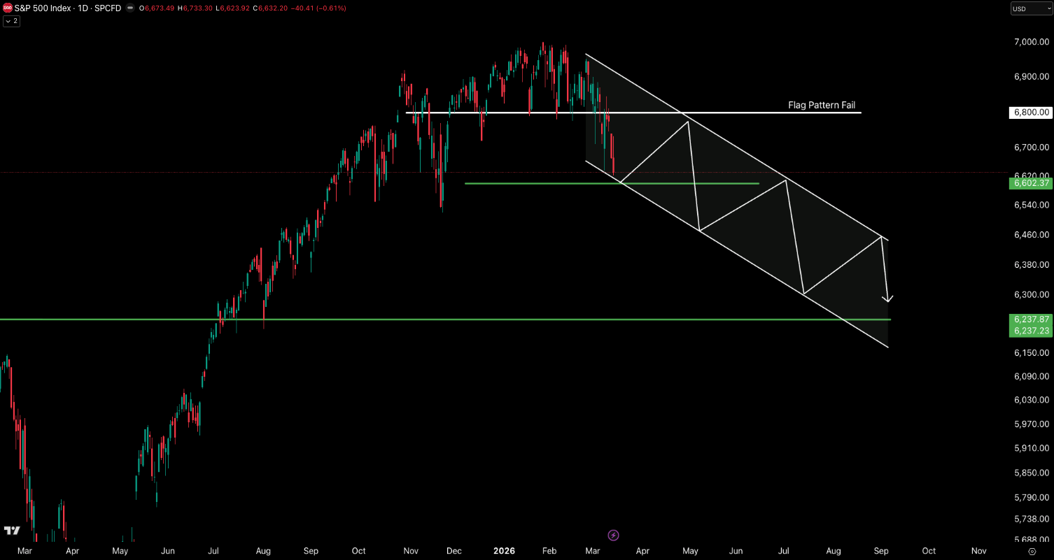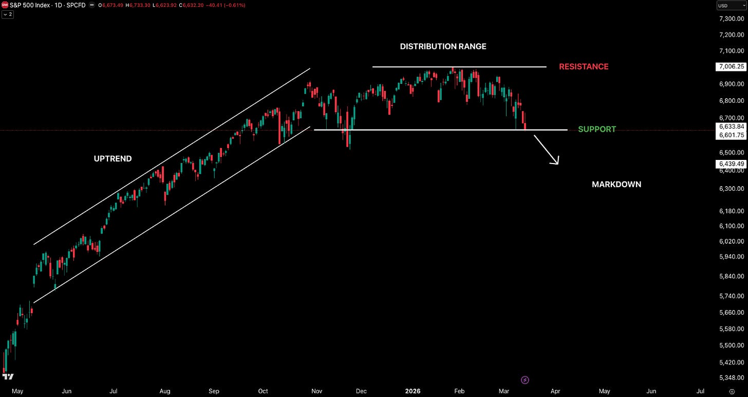 From the start of the chart above, the S&P 500 Index was in a clear uptrend, steadily making higher highs and higher lows through mid-2025 into early 2026, reflecting strong bullish momentum. As the market approached the ~7000 level, price began to stall and move sideways with multiple attempts to push higher, creating a distribution range where large participants were likely selling into strength. Volatility increased near the top, producing wider swings and signaling a weakening of trend control, and the structure gradually shifted from higher highs to lower highs, indicating momentum to the upside was lost. Price is now at a key support level ~6633. A break of this level confirms the distribution phase has ended and the market is transitioning into a potential markdown phase.