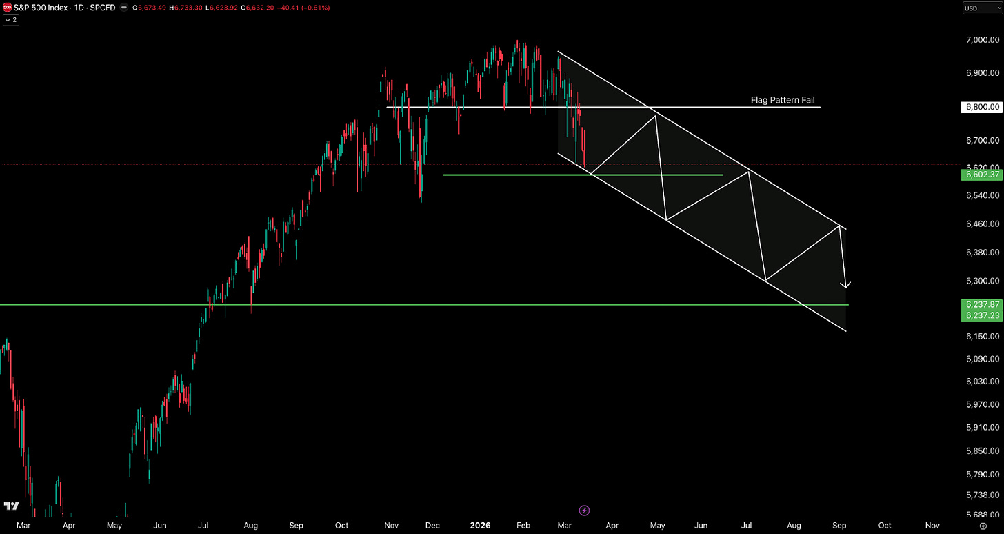 We are approaching a strong support level around 6602, which could result in a bounce and potentially mark the beginning of a series of lower highs and lower lows. I am anticipating the possibility of a bear flag continuation pattern. If price fails to reclaim the broken range and instead breaks lower again with strong volume, the pattern would suggest a second leg down toward roughly 6300–6200. However, a strong reclaim above 6800 would invalidate the bearish continuation pattern and instead suggest a short squeeze and a possible retest of the highs.